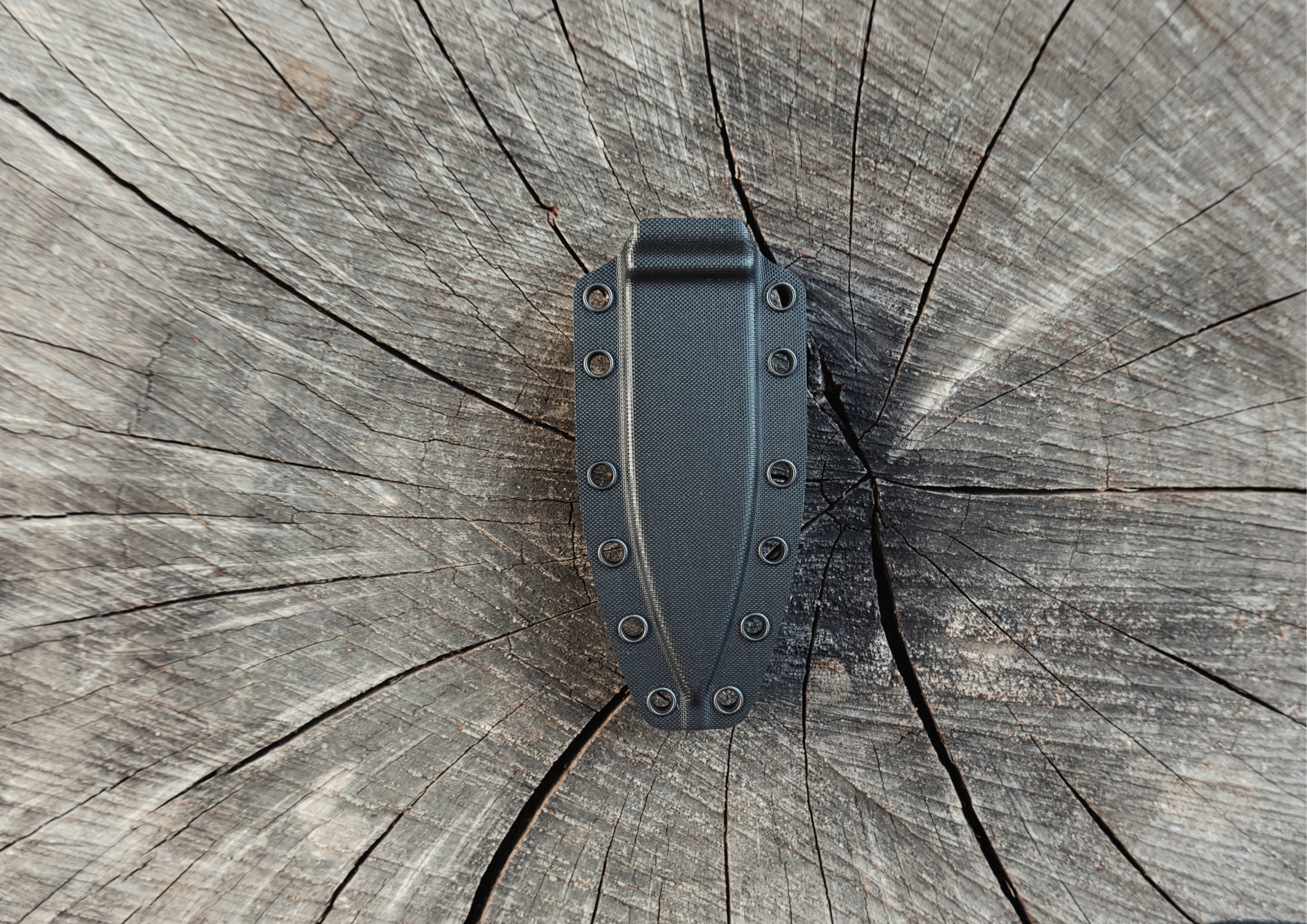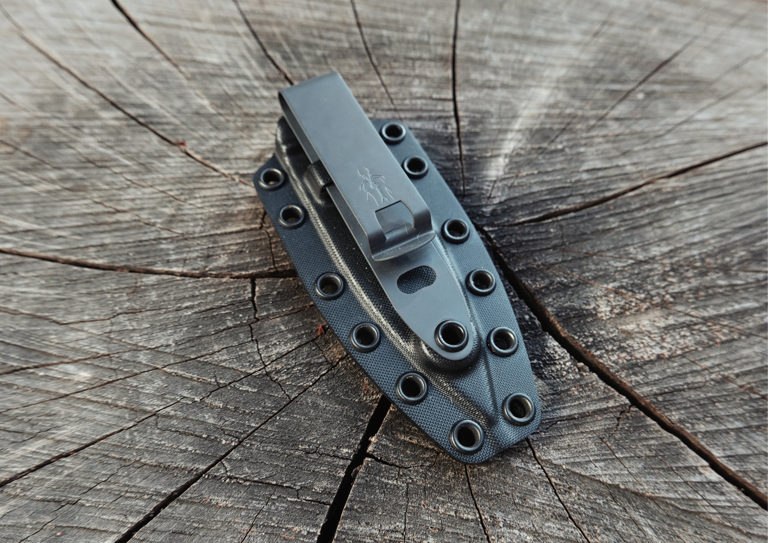 A spare black with black eyelets SEAF JR sheath that is extremely versatile and comes with a high quality Discreet Carry Concepts Clip attached. Having extra sheaths allows for permanent kit setups and the ability to have a sheath for EDC or utility belts. This Will fit the last couple models of jr.’s that are thinner handled and on. This will work with the short or longer handle thinner more recent models.